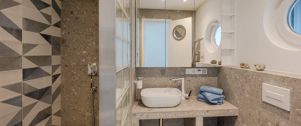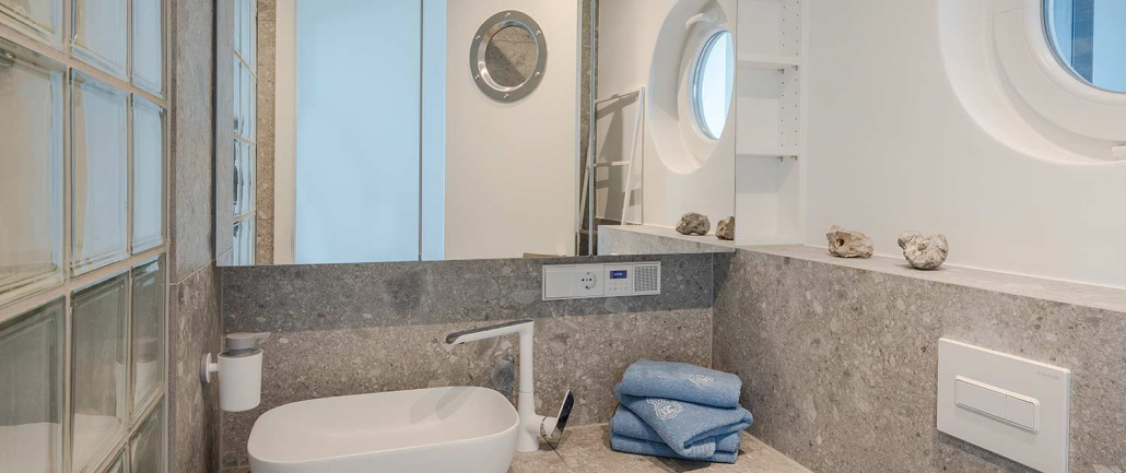 Ein offener Wohnbereich in der oberen Etage mit Balkon und Meerblick sowie ein begehbarer Kleiderschrank gehören zu den Highlights dieses Appartements. Im Schlafzimmer gibt es ein komfortables, großes Doppelbett von dem aus Sie den Horizont sehen können. Eine moderne Badewanne und ein Badezimmer mit Regendusche machen dieses Appartement zu etwas ganz besonderem.