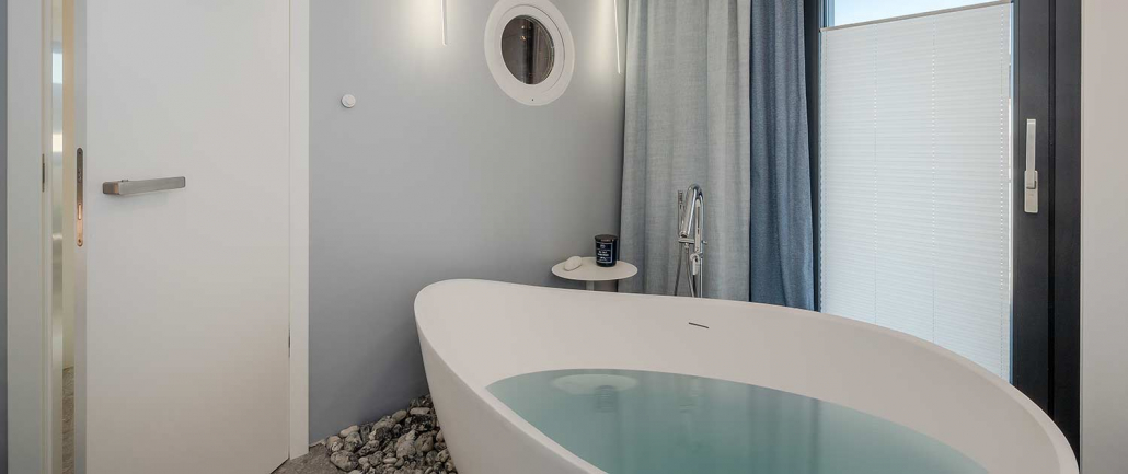 Im modernen Schlafbereich mit LED TV findet sich ebenfalls eine freistehende, von Ostsee Gestein umgebende Wellness Badewanne für angenehme Abende – allein oder zu Zweit.